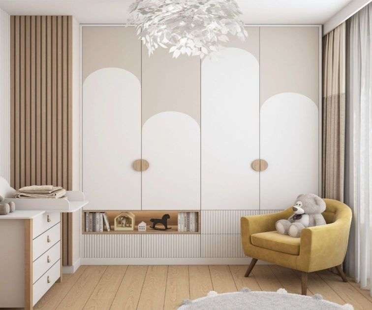 Modern Swing Wardrobe Design With Open Space And Drawer For Kids Bedroom
